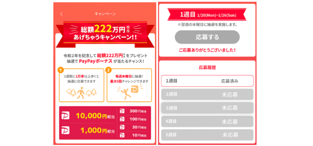 「WalkCoinで総額222万円相当あげちゃうキャンペーン」は、令和2年を記念して、抽選で総額222万円相当のPayPayボーナスをプレゼントするものです。「WalkCoin」を利用して1週間(月~日曜日)に1万歩以上歩くと、1月29日から2月26日の毎週水曜日の抽選(計5回)に応募できます。