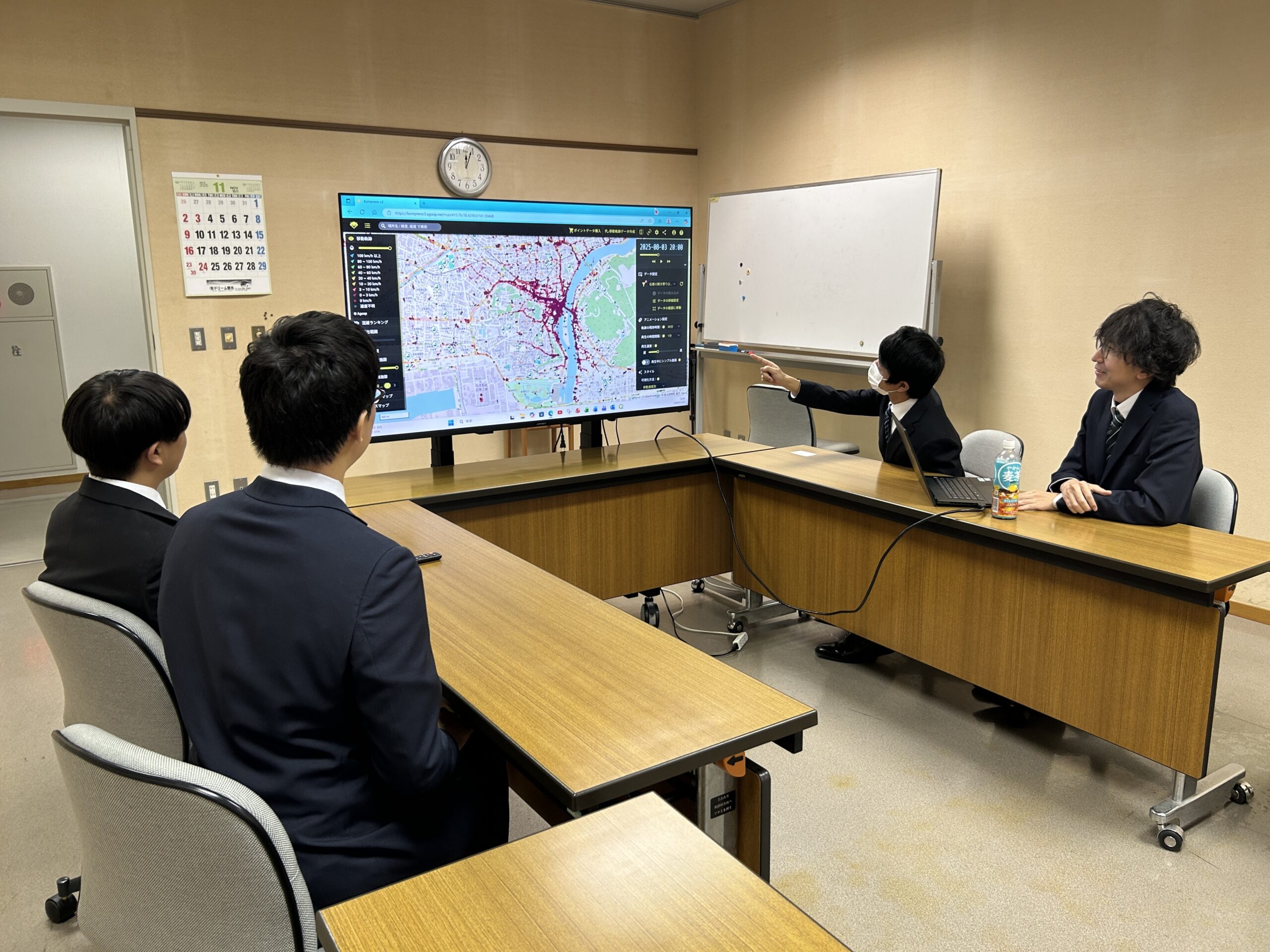 最大の決め手は、学生一人ひとりにアカウントを発行できる点と、直感的な操作性(UI)です。 これまでは教員の操作画面を学生が見るだけになりがちでしたが、導入後は学生自身がPCでログインし、手元のツールで自由に操作できるようになりました。 専門知識がない学生でも、「コンプレノでは前日の人流をすぐに可視化することができ、スライダーを動かすだけで時系列の人の流れを視覚的に把握できたり、「マチレポでは、任意のエリアの来訪者を自由に分析したりすることが可能です。失敗を恐れず何度でもトライアンドエラーができる環境は、私たちが求める教育現場のニーズに合致していました。