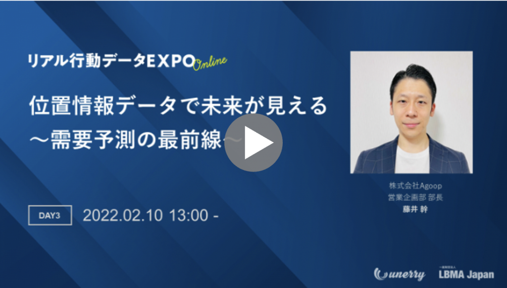 株式会社unerry主催「リアル行動データEXPO Online」の講演動画です。位置情報を活用した需要予測の最前線をご紹介します。