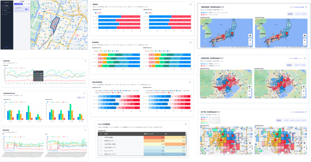 1画面で複数のグラフを確認できる集約型のダッシュボードで、エリアや期間を複数選択して比較できます。